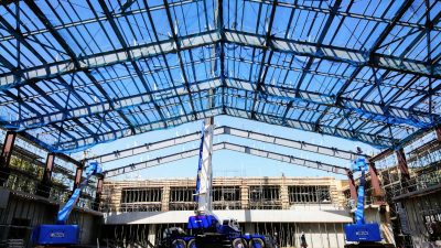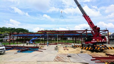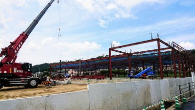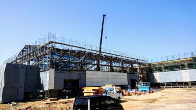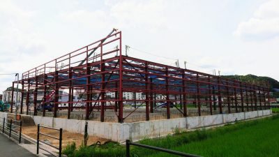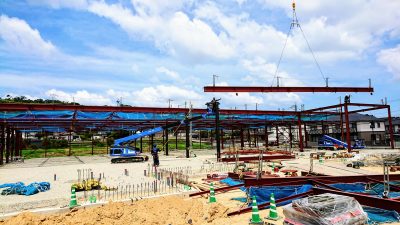 飯塚市で建方中のS自販アリーナの現場です。
